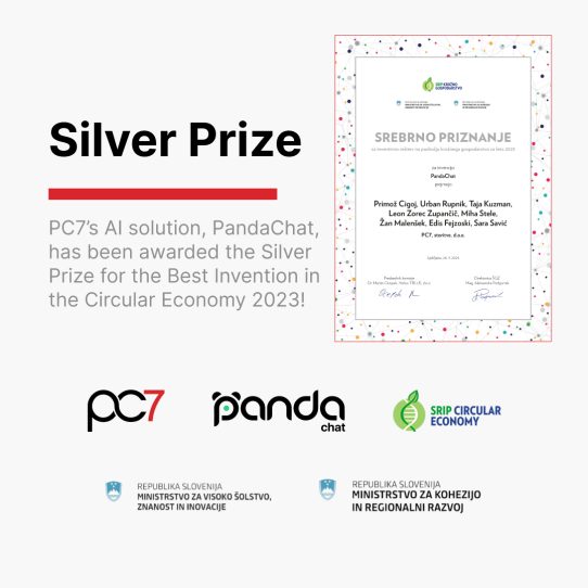 We are proud to share that the PandaChat team received the Silver National Innovation Award from the Chamber of Commerce and Industry of Slovenia at Dan Inovativnosti 2024. This recognition marks an important step in our mission to build technology that is both impactful and kind to the planet.