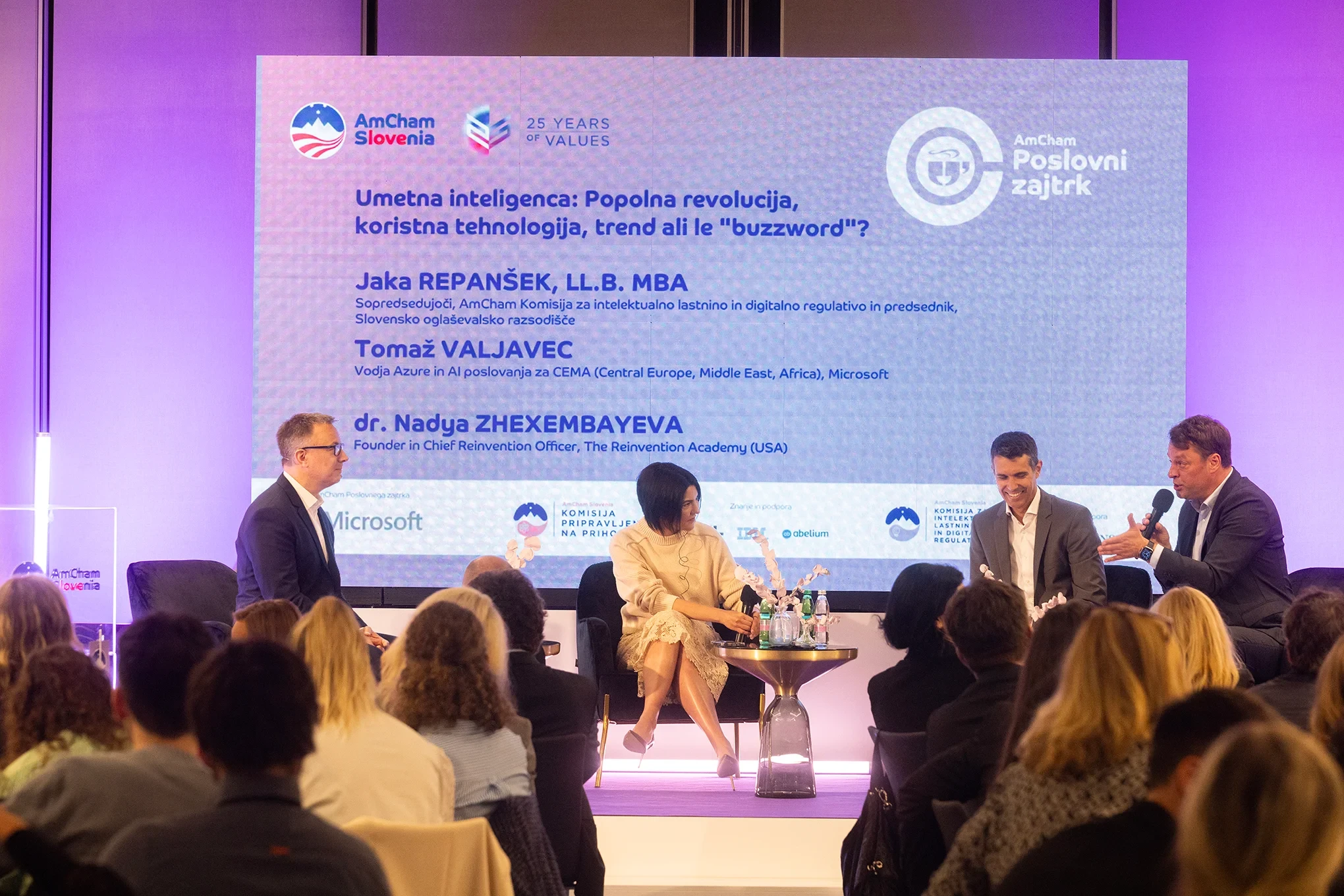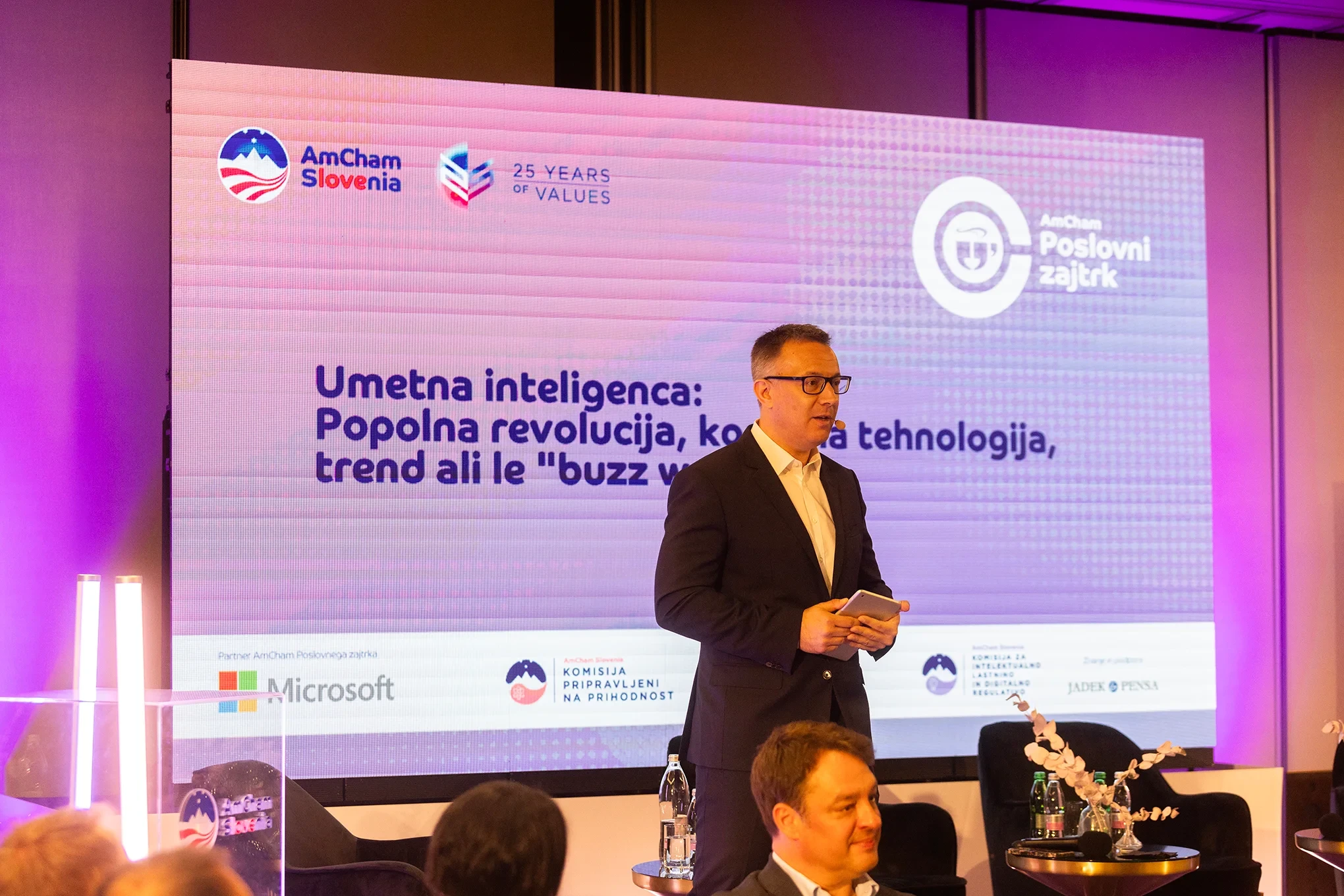 AmCham Slovenia's recent Business Breakfast served as a dynamic forum where industry luminaries convened to dissect the multifaceted impact of artificial intelligence (AI) on modern business practices. Themed "Artificial Intelligence: A Complete Revolution, Useful Technology, Trend, or Just a 'Buzzword'?", the event resonated with the unanimous agreement among speakers that innovation, AI integration, and adaptability are non-negotiable imperatives for thriving in today's globalized economy. Among the distinguished speakers, PandaChat's CEO and Founder took stage, spotlighting the groundbreaking role PandaChat plays in reshaping business operations through AI integration.